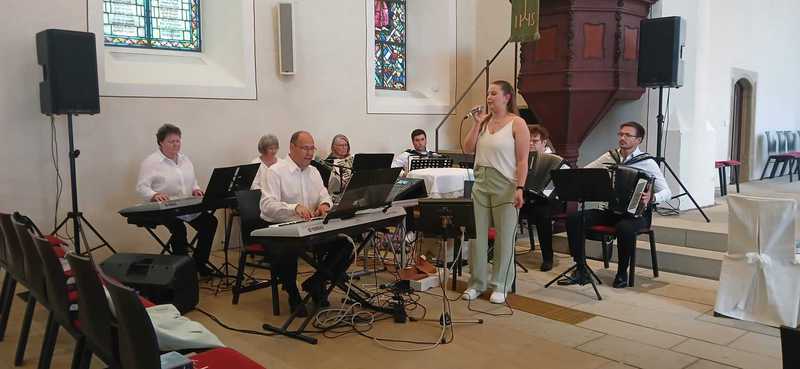 Nach dem Gottesdienst durften wir die zahlreichen Gäste ab der Mittagszeit unterhalten. Die Stimmung, das Essen und auch das Wetter konnten nicht besser sein. Bei weit über 30 Grad heizten wir dem Publikum so richtig ein. Die Getränke und auch der Schweiß flossen in Mengen.